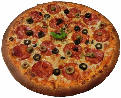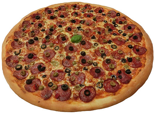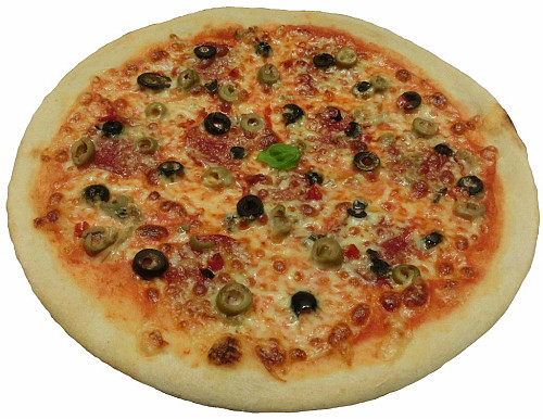 paradajkový základ, syr mozzarella, pikantná saláma, olivy čierne a zelené, chilli