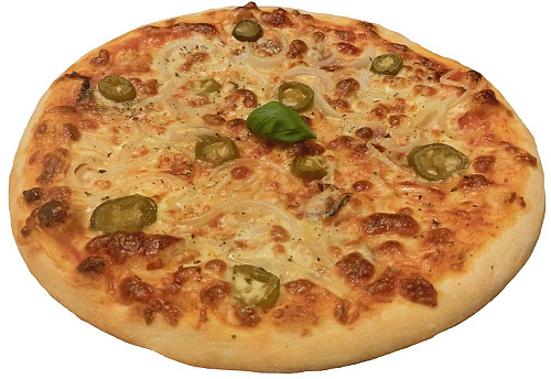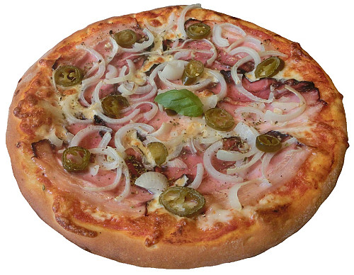 paradajkový základ, syr mozzarella, cibuľa, jalapeňo, anglická slanina