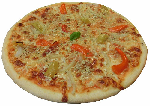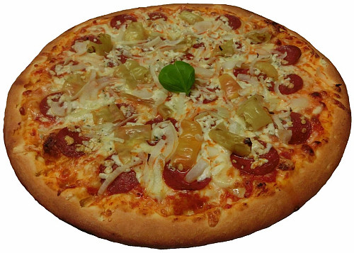paradajkový základ, syr mozzarella, cibuľa, syr niva, klobása, baranie rohy