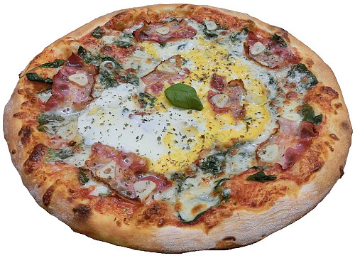 paradajkový základ, syr mozzarella, oravská slanina, vajíčko, cesnak, syr parmezán, baby špenát